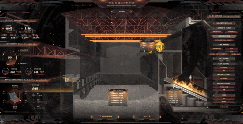 基于可視化技術(shù)的運(yùn)營條件信息管理系統(tǒng),本案例為垃圾發(fā)電設(shè)備和動力總成構(gòu)建三維模型,2D 面板聯(lián)動三維場景,以圖表形式幫助運(yùn)營管理人員實時監(jiān)測檢測參數(shù),運(yùn)用 2D 組態(tài)展示流程可視化動畫效果協(xié)助理清工作原理。各階段工廠流程能夠根據(jù)指定命令下鉆切換至三維場景,以滿足不同管理人員的業(yè)務(wù)需求。