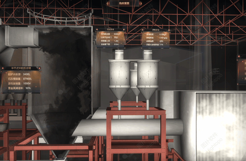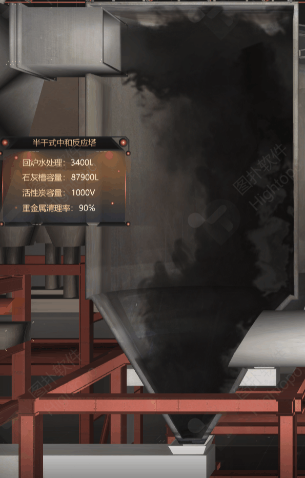 煙氣凈化系統(tǒng)是組合了半干式反應(yīng)塔、活性炭定量裝置、布袋式除塵器這三個步驟的系統(tǒng)。HT 通過對垃圾在焚燒所產(chǎn)生的煙氣、煙氣處理系統(tǒng)、凈化后通過煙囪排入大氣等過程對煙氣進(jìn)行虛擬仿真,在場景內(nèi)模擬煙氣凈化過程。煙氣經(jīng)過余熱鍋爐放出熱量后進(jìn)入噴霧吸收反應(yīng)塔。