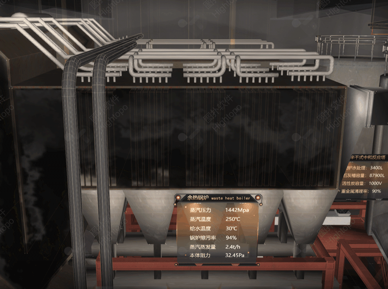 Hightopo 以垃圾焚燒發(fā)電為研究對象,依托自主研發(fā)的 HT for Web 產(chǎn)品,將其設(shè)備流程進(jìn)行可視化演示。將垃圾焚燒發(fā)電站的煙塵排放情況以及處理技術(shù)、工藝流程、環(huán)境狀況以及機(jī)器故障等仿真模擬。直觀地顯示垃圾焚燒的執(zhí)行進(jìn)度、設(shè)備的運(yùn)行狀態(tài)、煙氣污染物的控制狀況等,實現(xiàn)垃圾發(fā)電站生產(chǎn)數(shù)據(jù)的可視化管理與應(yīng)用。