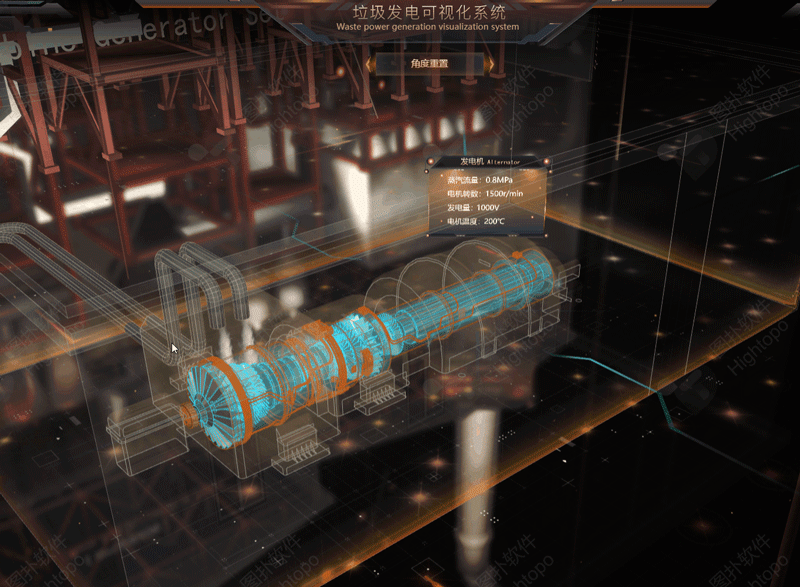 垃圾焚燒系統(tǒng)完全燃燒所產(chǎn)生的熱能經(jīng)余熱鍋爐轉(zhuǎn)化為蒸汽,再由蒸汽輪機(jī)發(fā)電機(jī)轉(zhuǎn)化為電能,從而完成一系列的能量轉(zhuǎn)換。系統(tǒng)結(jié)合 5G 通信系統(tǒng),全方面支持對鍋爐燃燒數(shù)據(jù)可視分析。通過 3D 模型形象呈現(xiàn)發(fā)電機(jī)外部結(jié)構(gòu)和工作狀態(tài);蒸汽流量、電機(jī)轉(zhuǎn)數(shù)、發(fā)電量、電機(jī)溫度等顯示在 2D 面板,自動播放。