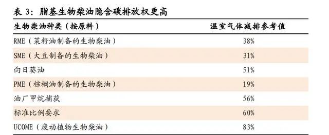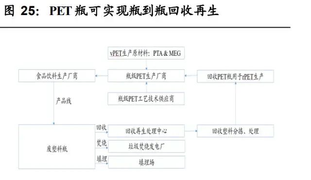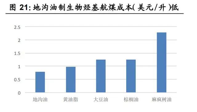 再生油:碳約束推動(dòng)需求高增,再生地溝油產(chǎn)業(yè)升級(jí)將至碳約束推動(dòng)需求高增,再生地溝油產(chǎn)業(yè)升級(jí)將至。1)碳約束刺激再生油需求,歐洲生物柴油量?jī)r(jià)將長(zhǎng)期處于高位。2)國(guó)際政策推動(dòng)國(guó)內(nèi)地溝油利用“高端化”:車用油方面,“烴基化”趨勢(shì)明顯;航油方面,國(guó)際航協(xié)2050碳中和目標(biāo)推動(dòng)生物質(zhì)烴基航煤需求釋放。地溝油制烴基柴油附加值將較UCOME顯著提升,再生地溝油向著高端產(chǎn)品升級(jí)的產(chǎn)業(yè)趨勢(shì)明顯。1. 碳約束刺激需求,歐洲生物柴油量?jī)r(jià)將長(zhǎng)期處于高位歐洲生物柴油需求旺盛,量?jī)r(jià)將長(zhǎng)期處于高位。1)歐盟是全球生物柴油最大的消費(fèi)市場(chǎng),目前歐盟生物柴油消費(fèi)量占全球總消費(fèi)量的 40%。2)發(fā)達(dá)國(guó)家強(qiáng)制按比例添加:伴隨《歐盟可再生能源指令》于2021年開始實(shí)施,歐洲公路運(yùn)輸行業(yè)的生物柴油摻混比例將從 10%提升至25%,需 求將在未來10年保持增長(zhǎng)態(tài)勢(shì)。按照目前全球生物柴油產(chǎn)能計(jì)算,到2030年歐洲地區(qū)將至少出現(xiàn)1000萬噸/年的供給缺口;如果考慮美國(guó)拜登政府改變碳減排政策帶來的需求增加以及歐洲地區(qū)淘汰ILUC高風(fēng)險(xiǎn)燃料的影響,總體供給缺口將達(dá)1500萬噸/年。3)廢油脂基生物柴油(UCOME)隱含碳排放權(quán)更高,節(jié)碳效果最為突出,競(jìng)爭(zhēng)優(yōu)勢(shì)明顯,長(zhǎng)期處于供不應(yīng)求狀態(tài)。2. 國(guó)際政策推動(dòng)國(guó)內(nèi)地溝油利用“高端化”,產(chǎn)業(yè)升級(jí)將至目前我國(guó)地溝油資源化終端產(chǎn)物主要以脂肪酸甲酯為主,隨著國(guó)際政策驅(qū)動(dòng)以及地溝油脫氧加氫制先進(jìn)燃料生物烴基柴油/航煤技術(shù)進(jìn)入成熟階段,我國(guó)地溝油資源化終端產(chǎn)品將由脂肪酸甲酯產(chǎn)品向生物質(zhì)烴基柴 油/航煤升級(jí),產(chǎn)品附加值將逐步提升,產(chǎn)業(yè)升級(jí)良機(jī)將至。地溝油經(jīng)加工再利用而制備的生物質(zhì)燃料,包括生物柴油、可再生柴油以及生物質(zhì)航煤:1)生物柴油是廢油脂或動(dòng)植物油脂經(jīng)酯交換或酯化制成的脂肪酸甲酯(FAME),需要與常規(guī)化石柴油摻混使用, 目前我國(guó)地溝油資源化終端產(chǎn)物主要以脂肪酸甲酯為主(UCOME);2)可再生柴油是廢油脂或動(dòng)植物油脂通過加氫和異構(gòu)化得到的烴基柴油(HVO/HEFA),為國(guó)際認(rèn)可的先進(jìn)生物燃料,可完全替代化 石柴油或與化石柴油制成調(diào)和燃料;3)生物質(zhì)航煤是由廢油脂經(jīng)加氫處理得到 HEFA 后,經(jīng)異構(gòu)化生成。國(guó)際政策推動(dòng)國(guó)內(nèi)地溝油利用“高端化”:1)車用油“烴基化”趨勢(shì)明顯。未來伴隨歐洲對(duì)于添加比例、排放標(biāo)準(zhǔn)等約束趨嚴(yán),車用油面臨“烴基化”趨勢(shì),生物柴油將向著可再生柴油方向升級(jí)。2) 國(guó)際航協(xié) 2050碳中和目標(biāo)推動(dòng)生物質(zhì)烴基航煤需求釋放。國(guó)際航協(xié)設(shè)立2050年實(shí)現(xiàn)碳中和的強(qiáng)制性目標(biāo),生物質(zhì)航煤作為主要減 排手段需求量將攀升。①作為高排放行業(yè)之一,2019年航空業(yè)占全 球碳排放量的 2%。②國(guó)際航協(xié)(IATA)于 2021 年 10 月通過決議, 290 個(gè)成員航司在 2050 年實(shí)現(xiàn)碳中和,助力實(shí)現(xiàn)巴黎協(xié)定控制溫升 的目標(biāo)。計(jì)劃減排量相當(dāng)于 2050 年前累計(jì)減排 212 億噸二氧化碳 當(dāng)量。③現(xiàn)有技術(shù)中,生物質(zhì)航煤為主的環(huán)保航空燃料將為主要的 減排手段,環(huán)保燃料預(yù)計(jì)貢獻(xiàn) 65%碳減排量。IATA 初步目標(biāo)為, 2025 年環(huán)保航空燃料產(chǎn)量由 2019 年的 1.4 億升提升至 79 億升, IEA 測(cè)算全球生物質(zhì)航煤的產(chǎn)量在 2021 至 2026CAGR77%。以地溝油等廢油脂作為原材料的生物烴基航煤(HFEA)目前已技術(shù)成熟、成本相對(duì)較低、得油率較高。1)HFEA 作為目前唯一進(jìn)入 商業(yè)化應(yīng)用階段的生物質(zhì)航煤技術(shù),生產(chǎn)成本為 0.88 歐元/升,為各 技術(shù)中最低,且得油率為 0.9,遠(yuǎn)高于其他技術(shù)得油率(Pavlenko et al., 2019)。2)據(jù)IRENA,地溝油生產(chǎn)生物質(zhì)烴基航煤的成本低于 大豆油、棕櫚油,根據(jù)現(xiàn)有資料測(cè)算,地溝油航煤成本僅相當(dāng)與棕 櫚油航煤的 62%,具有較強(qiáng)的成本優(yōu)勢(shì)。再生地溝油產(chǎn)品附加值將逐步提升,產(chǎn)業(yè)升級(jí)良機(jī)將至。受到成本和隱含碳稅影響,目前海外的生物質(zhì)航煤價(jià)格遠(yuǎn)高于化石航煤,生 物質(zhì)航煤的需求基本都是受到政策驅(qū)動(dòng)。據(jù) Argus media 統(tǒng)計(jì),2020 年生物質(zhì)航煤價(jià)格為化石航煤的 3-6 倍。地溝油制生物質(zhì)航煤產(chǎn)品 附加值將較 UCOME 顯著提升,再生地溝油向著高端產(chǎn)品升級(jí)的產(chǎn) 業(yè)趨勢(shì)明顯。再生塑料:政策推動(dòng)需求釋放,PET 瓶對(duì)瓶高端回收應(yīng)用替換速度超預(yù)期 回收再生利用為廢塑料的最佳處置方式。再生塑料節(jié)能減碳,為實(shí)現(xiàn)碳 中和的重要手段之一。政策驅(q