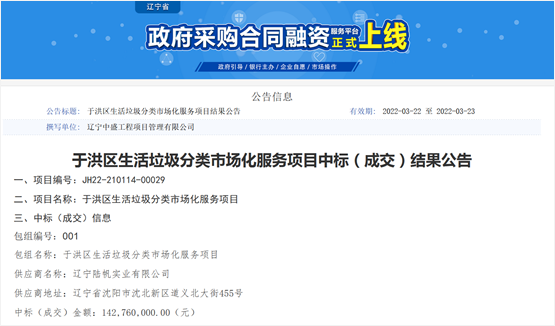 遼寧省政府采購網(wǎng)消息,2022年3月22日,沈陽市于洪區(qū)生活垃圾分類市場化服務項目公布開標結(jié)果,成交價1.4276億元。