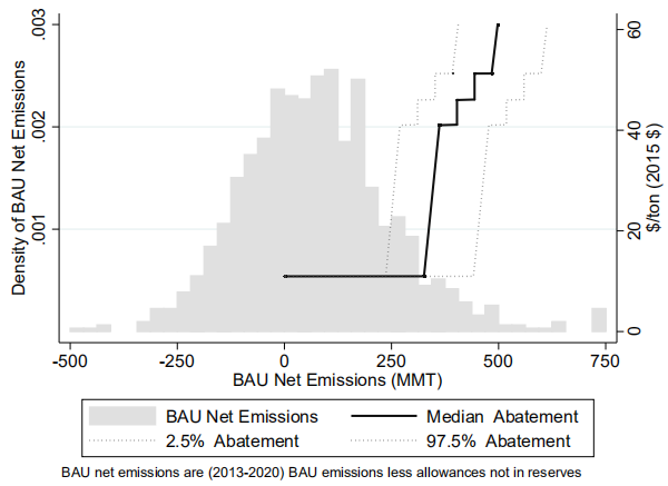 如圖2所示,通過分析減排需求和減排供給的估計(jì)值,文章發(fā)現(xiàn)市場(chǎng)出清時(shí),溫室氣體交易的價(jià)格有94.8%的概率處于或者接近價(jià)格下限即拍賣底價(jià)(Auction Reserve Price,ARP)。這意味著相對(duì)于估計(jì)得到的BAU排放量,排放配額的設(shè)定過高,此時(shí)經(jīng)濟(jì)主體通過非市場(chǎng)因素的配套政策即可完成溫室氣體減排約束,無需在交易市場(chǎng)上高價(jià)購買排放配額。價(jià)格處于“內(nèi)部均衡”,即均衡價(jià)格高于價(jià)格下限ARP但低于價(jià)格上限(Allowance Price Containment Reserve,APCR)的概率為1.2%,此時(shí)溫室氣體排放的價(jià)格彈性較高,配額交易市場(chǎng)的減排有效性達(dá)到最優(yōu)狀態(tài)。