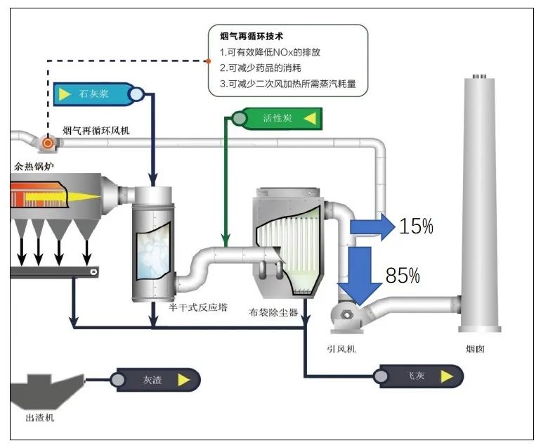 目前能夠滿足《生活垃圾污染控制標準》(GB18485-2014)和歐盟EU2010/75/EC排放標準的煙氣凈化處理工藝以“SNCR+半干法+干法+活性炭+袋式除塵”和“SNCR+半干法+干法+活性炭+袋式除塵+濕法”為主。但部分省市對NOx的排放標準提出了更高的要求,如DB37/2376-2013山東省區(qū)域性大氣污染物綜合排放標準的重點控制區(qū)域NOx限值為100mg/m3,垃圾焚燒煙氣NOx排放濃度限值低于100mg/m3成了一個趨勢。部分焚燒項目因此增加了SCR工藝以適應更高的環(huán)保要求。主流的脫硝技術包括焚燒爐燃燒控制爐溫、煙氣再循環(huán)技術、SNCR系統(tǒng)、SCR系統(tǒng)以及ICR(PNCR)系統(tǒng),其中焚燒爐燃燒控制爐溫與煙氣回流技術可有效降低原始NOx濃度。但通常采用焚燒爐燃燒控制爐溫、煙氣回流以及SNCR脫硝系統(tǒng)的情況下,NOx排放值仍無法穩(wěn)定控制在100mg/m3以內。針對NOx排放限值為100mg/m3的垃圾焚燒項目,目前國內垃圾焚燒發(fā)電廠采用的脫硝工藝有SNCR+SCR系統(tǒng)以及SNCR+ICR(PNCR)系統(tǒng)。從上海環(huán)境洛陽項目應用組合“煙氣再循環(huán)+SNCR+ICR(PNCR)”脫硝工藝后運行工況穩(wěn)定性較好,綜合成本更低。對于原先未采用煙氣再循環(huán)工藝的焚燒廠,如在引風機前增加煙氣再循環(huán)工藝,可有效降低引風機的電功率,利用再循環(huán)風替代原有二次風,可實現引風機的運行功率降低約10%。而且,應用煙氣再循環(huán)工藝后,爐內過量空氣系數降低,焚燒爐出口NOx原始濃度可降低約30%-40%,穩(wěn)定控制在200mg/Nm3以內,入爐噸垃圾尿素消耗量可節(jié)約0.5kg左右,降低系統(tǒng)運行的能耗和藥劑消耗,實現碳減排。