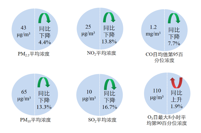 1—3月,全國339個地級及以上城市平均優(yōu)良天數(shù)比例為83.8%,同比上升2.9個百分點;PM2.5平均濃度為43微克/立方米,同比下降4.4%;PM10平均濃度為65微克/立方米,同比下降13.3%;O3平均濃度為110微克/立方米,同比上升1.9%;SO2平均濃度為10微克/立方米,同比下降16.7%;NO2平均濃度為25微克/立方米,同比下降13.8%;CO平均濃度為1.2毫克/立方米,同比下降7.7%。
