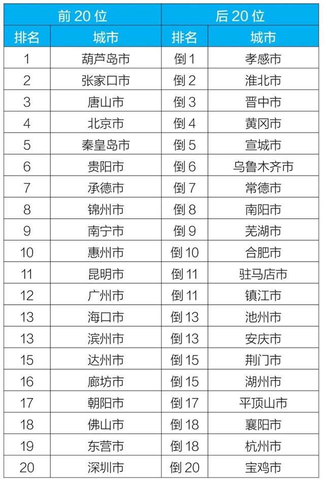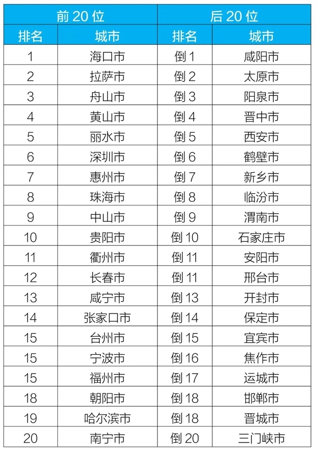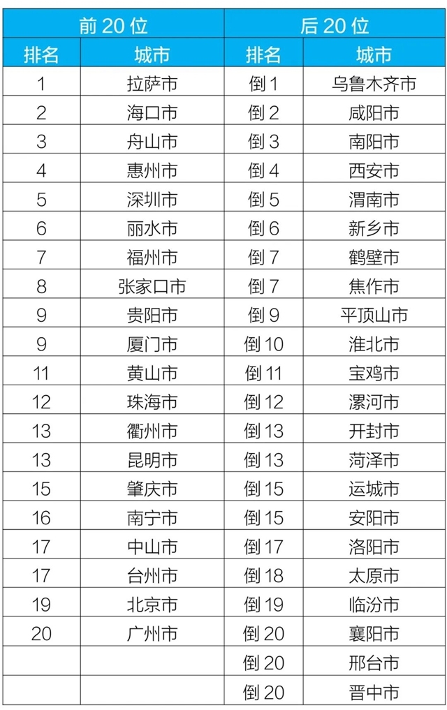 質量排名前20位和后20位城市名單