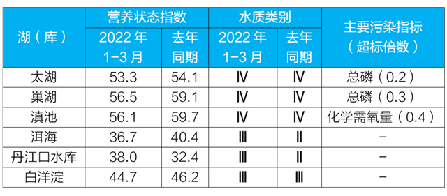 1-3月,監(jiān)測的192個重點湖(庫)中,水質(zhì)優(yōu)良(Ⅰ——Ⅲ類)湖庫個數(shù)占比78.1%,同比上升2.7個百分點;劣Ⅴ類水質(zhì)湖庫個數(shù)占比4.7%,同比上升1.0個百分點。主要污染指標(biāo)為總磷、化學(xué)需氧量和高錳酸鹽指數(shù)。176個監(jiān)測營養(yǎng)狀態(tài)的湖(庫)中,中度富營養(yǎng)8個,占4.5%;輕度富營養(yǎng)32個,占18.2%;其余湖(庫)為中營養(yǎng)或貧營養(yǎng)狀態(tài)。其中,太湖和巢湖均為輕度污染、輕度富營養(yǎng),主要污染指標(biāo)為總磷;滇池為輕度污染、輕度富營養(yǎng),主要污染指標(biāo)為化學(xué)需氧量;洱海、丹江口水庫和白洋淀水質(zhì)均良好、中營養(yǎng)。