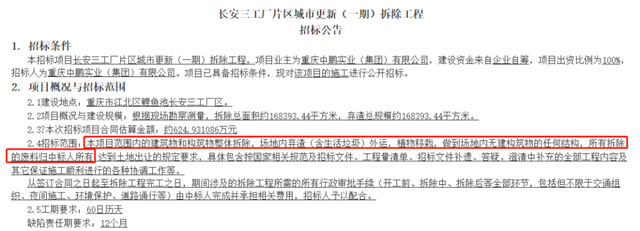 2022年2月23日,重慶中鵬實業(yè)(集團)有限公司發(fā)布了長安三工廠片區(qū)城市更新(一期)拆除工程的招標(biāo)公告。招標(biāo)公告稱,拆除總面積約168393.44平方米,棄渣總規(guī)模約168393.44平方米,合同金額約為約624.931086萬元。