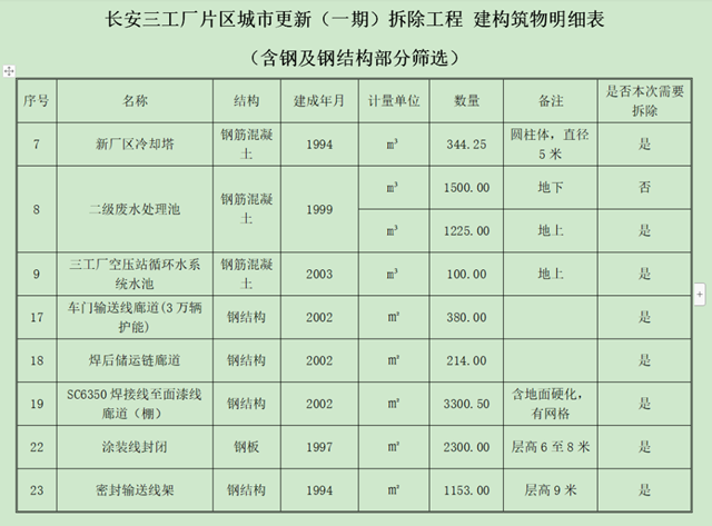 招標(biāo)文件附件中的《建構(gòu)筑物明細表》顯示,本次拆除共計26項內(nèi)容,幾乎全部為“新廠區(qū)冷卻塔、三工廠空壓站循環(huán)水系統(tǒng)水池、焊后儲運鏈廊道”等工廠廠區(qū)構(gòu)建及附近道路。可見,本次一期拆除的范圍應(yīng)該集中在該片區(qū)的工業(yè)用地內(nèi)。