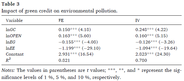 為了緩解模型中存在的由變量缺失或綠色信貸測量誤差引起的內(nèi)生問題,本研究采用綠色信貸的一階滯后項(xiàng)作為工具變量。表3中報告的工具變量法(IV)產(chǎn)生的估計結(jié)果與固定效應(yīng)模型基本一致??刂谱兞康南禂?shù)和顯著性水平也與之前的結(jié)果一致。