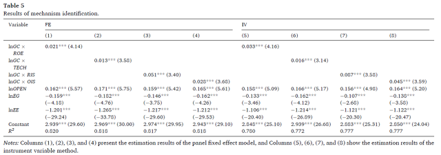 表5的結(jié)果顯示,以下交叉項(xiàng)的估計系數(shù)均在1%的顯著性水平上顯著:綠色信貸與企業(yè)績效(lnGC×ROE)、綠色信貸與企業(yè)創(chuàng)新(lnGC×TECH)、綠色信貸與產(chǎn)業(yè)結(jié)構(gòu)合理化(lnGC×RIS)、綠色信貸與產(chǎn)業(yè)結(jié)構(gòu)優(yōu)化(lnGC×OIS)。這證實(shí)了綠色信貸通過企業(yè)績效、企業(yè)創(chuàng)新和產(chǎn)業(yè)結(jié)構(gòu)升級這三個機(jī)制來改善環(huán)境質(zhì)量,這也是三個研究假設(shè)的結(jié)果。交叉項(xiàng)的估計系數(shù)存在差異:(lnGC×TECH)的估計系數(shù)最小,(lnGC×RIS)和(lnGC×OIS)的估計系數(shù)較大。這些結(jié)果表明,綠色信貸對通過企業(yè)抑制環(huán)境污染的作用。