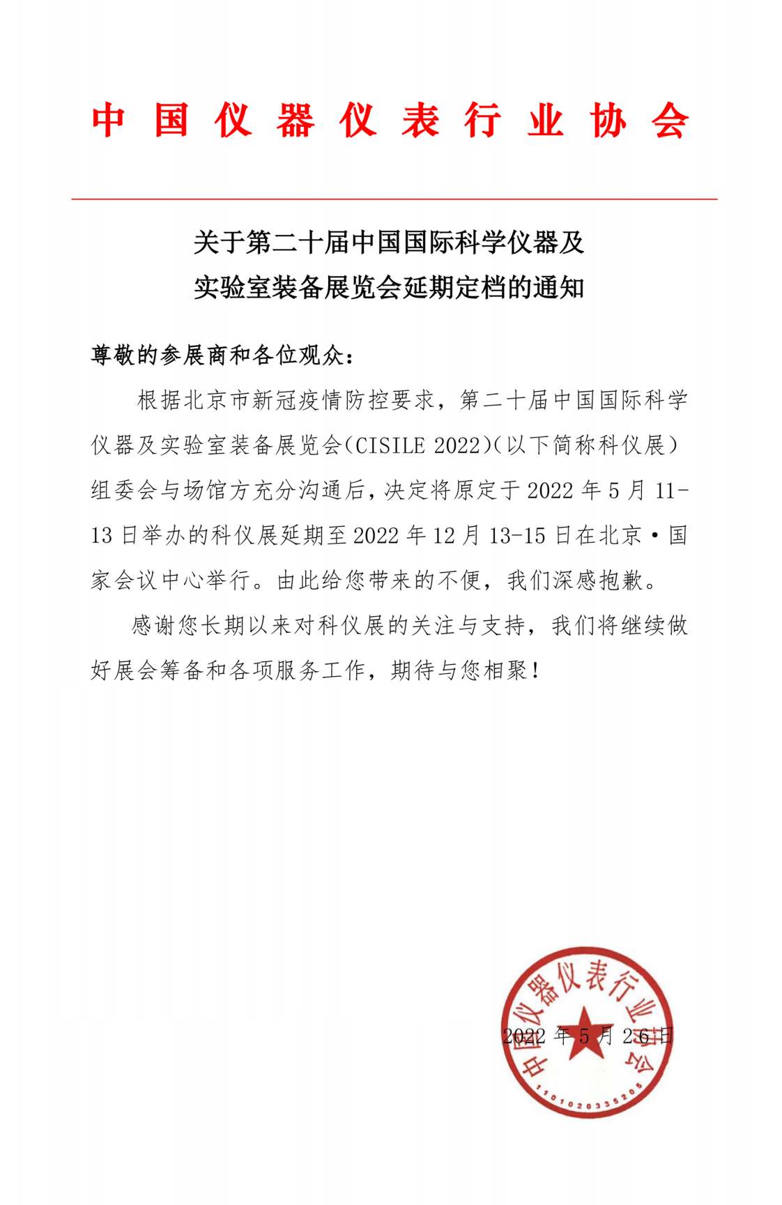 關(guān)于第二十屆中國(guó)國(guó)際科學(xué)儀器及實(shí)驗(yàn)室裝備展覽會(huì)延期定檔的通知