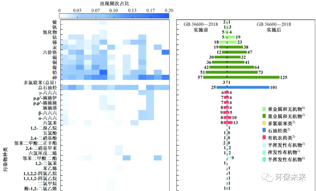 14 種行業(yè)企業(yè)特征污染物的出現(xiàn)頻次占比分布 (見圖 2) 顯示,在收集到的 537 個污染場地中,共出現(xiàn) 60 種污染物. 化學工業(yè)場地中特征污染物多樣,幾乎涵蓋了 60 種污染物中常見的污染物,包括苯系物、多環(huán)芳烴、重金屬、農(nóng)藥及石油烴等,這與已有研究結(jié)果[25-26] 一致. 金屬制品的主要污染物是 Ni、Cr6+、Cu、Cd、As 和 Pb 等重金屬,其中 Ni、Cr6+占比較大. 鋼鐵行業(yè)和金屬表面處理及熱處理加工場地涉及金屬熱處理、表面處理、機械加工等工藝,粉塵、煙塵等污染物的不當處置導(dǎo)致 Pb、Cu、As、Zn 和 Ni 等重金屬的產(chǎn)生[27-28]. 黑色冶煉的主要污染物是苯并 [a] 芘和重金屬 As,有色冶煉的主要污染物是重金屬 As 和 Ni. 金屬冶煉和壓延加工業(yè)場地中,含 As 化合物和焦炭等在工藝過程中的使用,導(dǎo)致 As 和多環(huán)芳烴等污染物的產(chǎn)生[29-30]. 電器制造的主要污染物是重金屬 Pb;其余行業(yè)的特征污染物分布比較零散.同時,在這 14 類行業(yè)中除造紙行業(yè)沒有統(tǒng)計到苯并 [a] 芘以外,其他行業(yè)均出現(xiàn)了多環(huán)芳烴類為主的半揮發(fā)性有機物,包括苯并 [a] 芘、二苯并 [a,h] 蒽、苯并 [b] 熒蒽、苯并 [a] 蒽、茚并 [1,2,3-cd] 芘和苯并[k] 熒蒽. 值得注意的是,重金屬污染物在不同行業(yè)的分布也很普遍,主要是 As、Pb、Ni、Cu、Cd 和 Cr6+,這與傳統(tǒng)的“五毒元素”相比,重金屬 Ni 替代了 Hg. 除此之外,苯系物為主的揮發(fā)性有機物和總石油烴類的污染物在不同行業(yè)中也有一定占比. 總之,在我國污染場地開展修復(fù)與管控工作中,多環(huán)芳烴類為主的半揮發(fā)性有機物作為各行業(yè)中突出的污染物質(zhì),是我國未來場地土壤環(huán)境治理工作的重點.與大氣和水的污染防治工作相比,我國建設(shè)用地土壤污染防治工作正處于初步發(fā)展階段. 原國家環(huán)境保護總局于 2004 年發(fā)布了《關(guān)于切實做好企業(yè)搬遷過程中環(huán)境污染防治工作的通知》,標志著我國工業(yè)污染場地環(huán)境管理的起步. 經(jīng)過 10 多年的探索和實踐,建設(shè)用地普適性的風險調(diào)查評估技術(shù)導(dǎo)則類標準和地方政府出臺的風險評估技術(shù)導(dǎo)則以及篩選值標準等相互補充,初步形成了包含場地調(diào)查、評估、修復(fù)管控與效果評估多環(huán)節(jié)的建設(shè)用地全過程土壤環(huán)境保護的標準體系. 在 GB 36600?2018 發(fā)布之前,各省份污染場地在進行修復(fù)管控時主要參考HJ 350?2007《展覽會用地土壤環(huán)境質(zhì)量評價標準》和 DB 11/T 811?2011《場地土壤環(huán)境風險評價篩選值》等起步較早和先行的地方管理標準為主體的標準文本;在 GB 36600?2018 發(fā)布之后,各省份污染場地在進行修復(fù)管控時則主要參考該標準,并結(jié)合一些地方標準開展場地管理工作. 這些標準中的篩選值和管制值提供了污染場地需要關(guān)注的污染物種類,明確了場地修復(fù)時污染物的管控指標,并將污染物清單區(qū)分為基本項目和其他項目,涵蓋了無機污染物、揮發(fā)性有機污染物、半揮發(fā)性有機污染物和農(nóng)藥/多氯聯(lián)苯及其他不同化學物質(zhì)等.GB 36600?2018 作為我國污染場地修復(fù)治理領(lǐng)域的重要管理標準,其頒布實施以來發(fā)揮著越來越重要的作用. 為了分析該標準實施后工業(yè)污染場地污染物管控指標的演變情況,以 GB 36600?2018 正式實施日期即 2018 年 8 月 1 日為分界線,嘗試分析GB 36600?2018 實施前后工業(yè)污染場地污染物管控指標出現(xiàn)頻次的變化,并探討其變化規(guī)律. 由圖 2 可知,GB 36600?2018 實施后污染物管控指標的出現(xiàn)頻次較 GB 36600?2018 頒布前總體增加,整體呈現(xiàn)左右不對稱的態(tài)勢. 從絕對增量來看,出現(xiàn)頻次增加明顯的有苯并 [a] 芘、總石油烴、砷、二苯并 [a,h] 蒽、苯并 [b] 熒蒽、苯并 [a] 蒽、六價鉻等污染物,這與收集案例的年份和數(shù)量有關(guān). 從相對增量來看,出現(xiàn)頻次增加特別明顯的是溶劑類揮發(fā)性和半揮發(fā)性有機物,包括苯系物、多環(huán)芳烴和總石油烴等. 苯、甲苯、乙苯、二甲苯和苯乙烯等統(tǒng)稱為苯系物,具有持久性、親脂性和高毒性等特征,對人類健康和生態(tài)環(huán)境具有較強的毒性和危害性[31-33]. 同時,部分多環(huán)芳烴作為光化學煙霧的重要前體物,其反應(yīng)活性較高,對霧霾天氣中細顆粒物的生成及其二次污染具有重要影響[34].總石油烴污染物遷移能力較強,具有毒性和“三致”危害,可通過食物鏈、呼吸作用等途徑進入人體,危害人體健康,被許多國家列為優(yōu)先控制污染物[35-36].值得指出的是,有機農(nóng)藥類和多氯聯(lián)苯 (總量)的出現(xiàn)頻次較 GB 36600?2018 頒布前有所減少,這是管理上可以進一步分析和應(yīng)對的新趨勢. 農(nóng)藥污染物以滴滴涕 (DDTs) 和六六六 (HCHs) 等有機氯農(nóng)藥為主,被列入《關(guān)于持久性有機污染物的斯德哥爾摩公約》首批受控制的持久性有機污染物[37-38]. 眾所周知,中國曾是有機氯農(nóng)藥生產(chǎn)和使用的大國,自 1983年開始停止生產(chǎn)和使用有機氯農(nóng)藥 DDTs 和 HCHs[39],但根據(jù)國外相關(guān)經(jīng)驗進行保守估計,仍存在 1 200 個以上的農(nóng)藥污染場地迫切需要治理[40]. 這類污