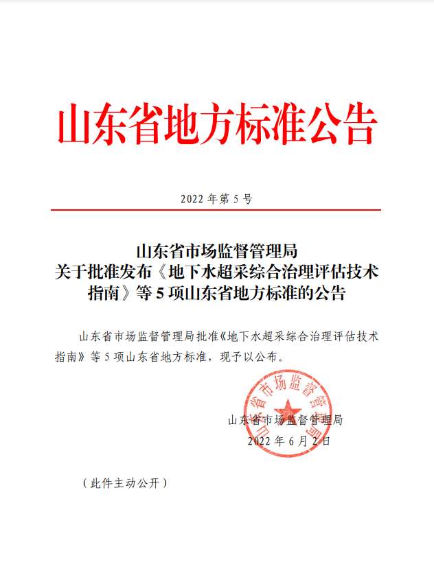 山東省市場監(jiān)督管理局關(guān)于批準發(fā)布《地下水超采綜合治理評估技術(shù)指南》等5項山東省地方標準的公告