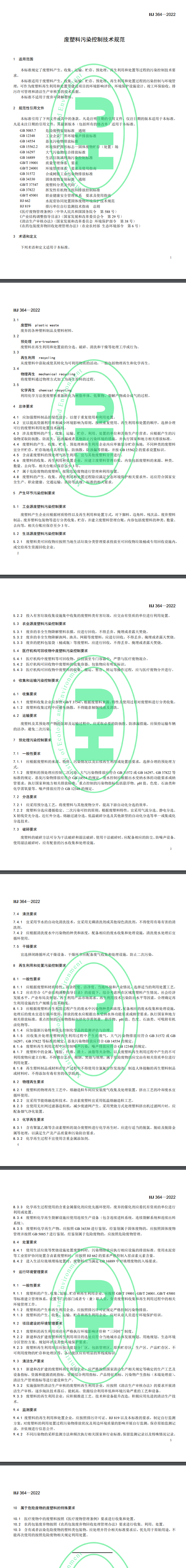 《廢塑料污染控制技術規(guī)范》(HJ 364-2022)