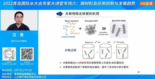 在此背景下,納米纖維堆疊是實(shí)現(xiàn)高通量、高截留的有效手段,當(dāng)然也存在抽濾難以放大,膜層由于較厚其滲透性也有待進(jìn)一步提高等問題。汪勇教授介紹,一個(gè)新的思路是以穩(wěn)定分散的碳納米管在大孔基地上堆積成膜。