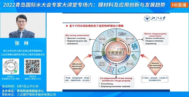 目前,無論是從鹵水提鋰、工業(yè)廢水分鹽資源化處理,還是從濃海水利用、飲用水鈣鎂選擇性去除等各方面來看,單/多價(jià)離子鹽分離需求的上漲都是可見的。“納濾是最具潛力的單多價(jià)陽離子分離技術(shù)之一”,張林副院長(zhǎng)對(duì)基于不同分離機(jī)理的離子選擇性NF膜設(shè)計(jì)路徑進(jìn)行了分析,還介紹了新型膜材料。