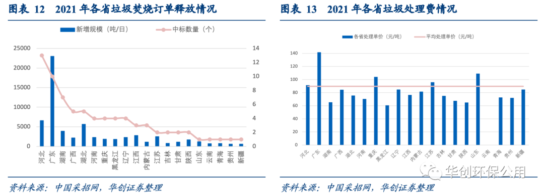 市場逐步向中西部和縣級下沉,小規(guī)模項目占比提升。2021年新增垃圾項目規(guī)模大于1000噸/日以上的總計15個,僅占五分之一;項目建設(shè)規(guī)模處于300~800噸/日的數(shù)量居多,共計50個。2021年,河北省成為釋放項目最多的省份(13個),廣東?。?0個)、湖南?。?個)、湖北省(5個)和廣西?。?個)分居二三四位。