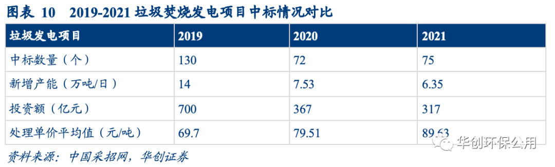 垃圾焚燒新訂單釋放速度減緩、處理費價格提升。2021年垃圾焚燒新增體量進一步下降,全年中標項目總處理規(guī)模達6.35萬噸/日,同比2020年下降15.67%。與此同時,2021年平均中標處理單價為89.63元/噸,同比2020 年增長12.73%。近三年以來中標價一直維持快速上升態(tài)勢,疊加政策推動,我們認為未來很可能按照“產(chǎn)生者付費”原則,實施居民處理費,健全收費機制,垃圾處理費單價有望進一步提升,降低對補貼依賴程度。