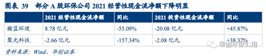 2021年8月,財政部發(fā)布了11個政府和社會資本合作(PPP) 會計處理實施問答,對PPP項目建造期間發(fā)生的建造支出在現(xiàn)金流量表中應(yīng)如何列示做出進一步說明:PPP項目建造期間相關(guān)建造支出作為投資性現(xiàn)金流列示調(diào)整至經(jīng)營性現(xiàn)金流列示。我們認為該會計準則的變更是2021年部分環(huán)保上市公司經(jīng)營性現(xiàn)金流下滑的原因之一。