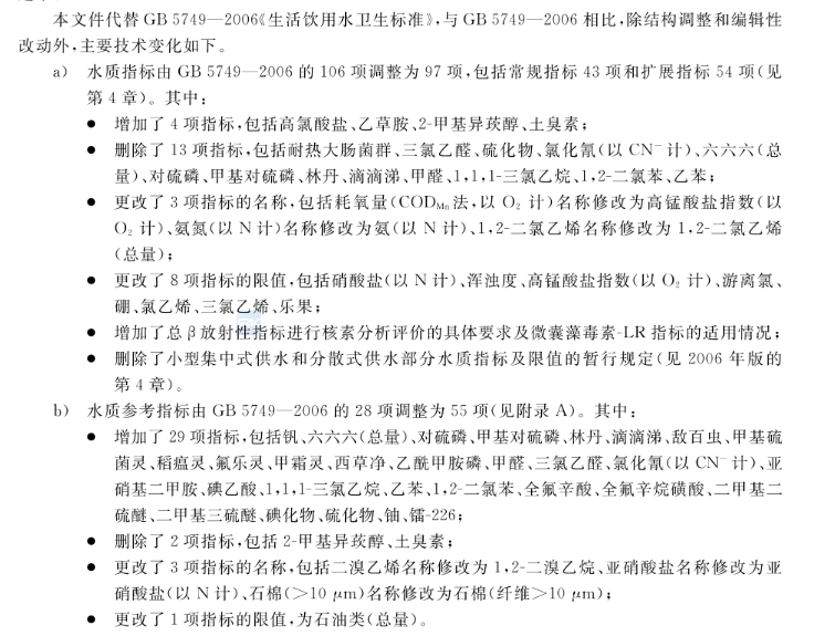 從主要技術層面上看,新標準顯示水質指標由GB 5749- 2006 的106 項調整為97項,包括常規(guī)指標43項和擴展指標54項。水質參考指標由GB 5749- 2006 的28項調整為55項。