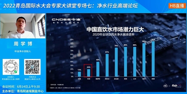 凈水行業(yè)的未來與數(shù)字經濟的不可分割性毋庸置疑,周學博表示,中國直飲水市場潛力巨大,凈水設備總容量達3億多臺,潛在年服務費以及耗材費約在3000億左右,其中商用占三分之二,家用占三分之一。未來10年,我國預計會新增近2億臺新裝機,并且濾芯更換規(guī)模超50億支。
