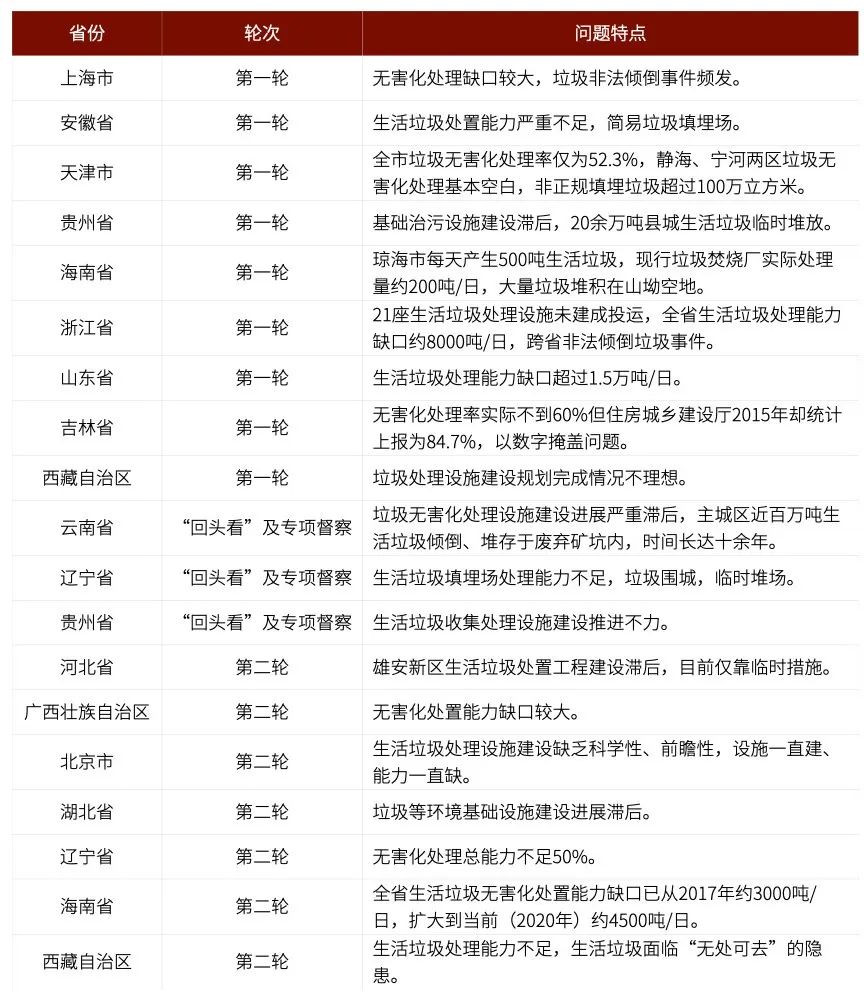 個(gè)別省區(qū)市歷史上無(wú)害化處理率低、無(wú)害化處理能力不足問(wèn)題嚴(yán)重。其中,山東省在第一輪例行督察中被中央環(huán)保督察組反饋“生活垃圾處理能力缺口超過(guò)1.5萬(wàn)噸/日”、云南省在“回頭看”及專(zhuān)項(xiàng)督察中被反饋“垃圾無(wú)害化處理設(shè)施建設(shè)進(jìn)展嚴(yán)重滯后,主城區(qū)近百萬(wàn)噸生活垃圾傾倒、堆存于廢棄礦坑內(nèi),時(shí)間長(zhǎng)達(dá)十余年”、北京市第二輪例行督察被反饋“生活垃圾處理設(shè)施建設(shè)缺乏科學(xué)性、前瞻性,設(shè)施一直建、能力一直缺”等。具體情況詳見(jiàn)表1。