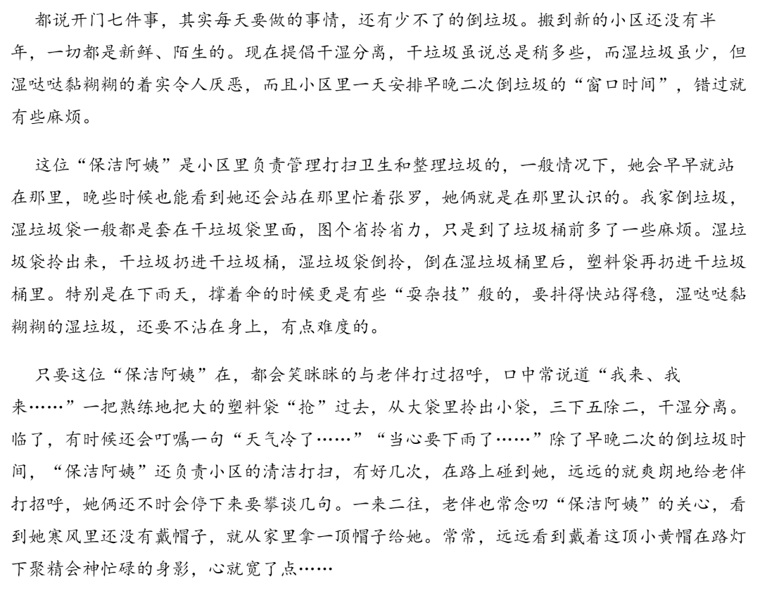 第三個收獲,是小區(qū)變得更干凈,不只是單元樓門口顯而易見的垃圾箱少了,而且整個小區(qū)啊,都會變得更干凈一些。比如說以前垃圾不分類的時候呢,垃圾袋是垃圾干,垃圾混在一起,會導致一些垃圾的滲濾液灑在路上。小區(qū)有很多垃圾桶,每天才收集一次,這些干濕垃圾在戶外靜置發(fā)酵一天,那么小區(qū)的味道就不會太好。另外道路上會有一些食物的殘渣、灑落的其它垃圾。現(xiàn)在垃圾分類,按袋投放,定時投放之后,這些各種原因?qū)е碌男^(qū)的這種惡化情況就幾乎絕跡了。大多數(shù)人可以明顯感覺到,小區(qū)更整潔、更干凈了。