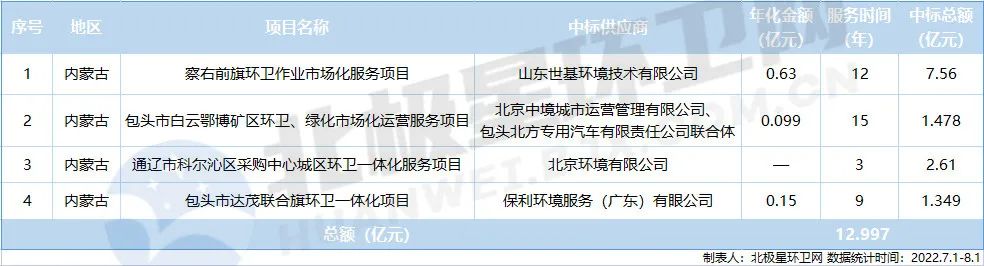 世基環(huán)境成7月最大“黑馬”,以7.56億元的價格拿下了內蒙古察哈爾右翼前旗環(huán)衛(wèi)作業(yè)市場化服務項目。據了解,山東世基環(huán)境2020年進駐內蒙古烏蘭察布市集寧區(qū),并成立全資子公司烏蘭察布世基環(huán)境科技有限公司,致力于中心城區(qū)、馬蓮渠鄉(xiāng)、白海子鎮(zhèn)內環(huán)衛(wèi)一體化作業(yè)。內蒙古烏蘭察布市察右前旗環(huán)衛(wèi)作業(yè)市場化服務項目是山東世基環(huán)境2022年中標的第二個環(huán)衛(wèi)項目。