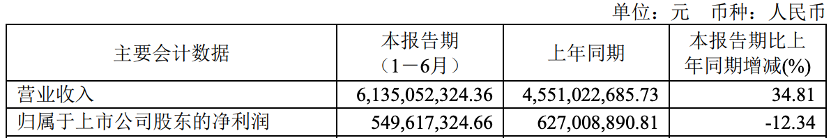 公司上半年營業(yè)收入為6,135,052,324.36元,同比增長34.81%;實現(xiàn)歸屬于上市公司股東的凈利潤為549,617,324.66元,同比下降12.34%。