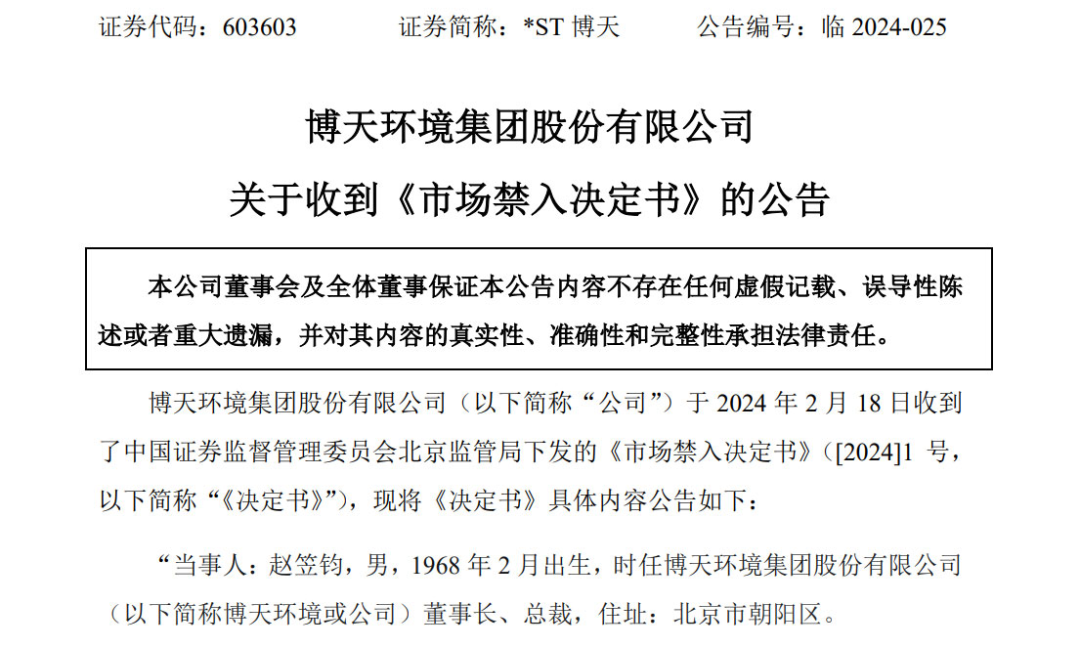 2月19日,博天環(huán)境公告稱,公司于2月18日收到北京證監(jiān)局下發(fā)的《市場禁入決定書》,認(rèn)定博天環(huán)境2017年、2018年、2019年、2020年、2021年年度報告存在虛假記載,構(gòu)成《證券法》所述的信息披露違法行為。