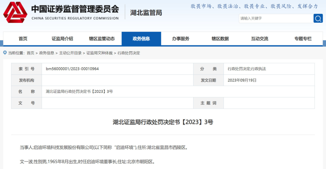 還有此前曾被媒體曝出過“財(cái)務(wù)造假”的啟迪環(huán)境。2023年9月,湖北證監(jiān)局官網(wǎng)披露,因信息披露違法,對啟迪環(huán)境給予警告并處罰款60萬元,對時任董事長文一波等4位相關(guān)責(zé)任人給予警告并處罰款30萬元。