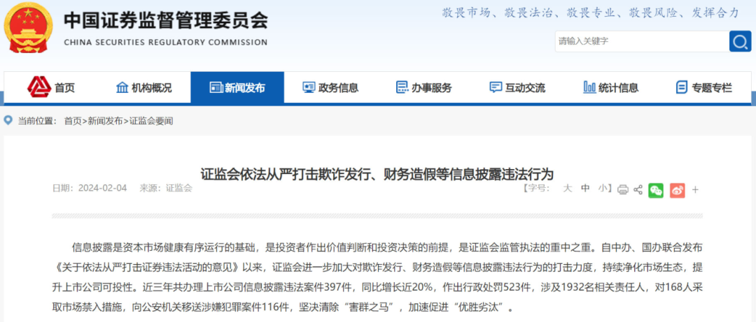 證監(jiān)會表示,近三年,他們共辦理上市公司信息披露違法案件397件,同比增長近20%,作出行政處罰523件,涉及1932名相關(guān)責(zé)任人,對168人采取市場禁入措施,向公安機(jī)關(guān)移送涉嫌犯罪案件116件,堅(jiān)決清除“害群之馬”,加速促進(jìn)“優(yōu)勝劣汰”。
