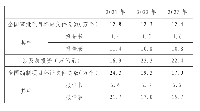 2023年全國共審批項目環(huán)評文件12.4萬個,同前兩年基本持平。近三年全國審批及編制環(huán)評文件數(shù)量情況見表1。表1 近三年全國審批及編制環(huán)評文件數(shù)量統(tǒng)計