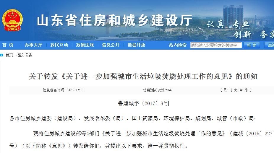 北極星節(jié)能環(huán)保網(wǎng)訊:北極星節(jié)能環(huán)保網(wǎng)獲悉,近日山東省住房和城鄉(xiāng)建設(shè)廳、山東省住房和城鄉(xiāng)建設(shè)廳、山東省發(fā)展和改革委員會以及山東省國土資源廳山東省環(huán)境保護(hù)廳聯(lián)合發(fā)布關(guān)于轉(zhuǎn)發(fā)《關(guān)于進(jìn)一步加強(qiáng)城市生活垃圾焚燒處理工作的意見》的通知,通知提到,原則上,全省新上城市生活垃圾處理項(xiàng)目,要一律選擇焚燒(發(fā)電)處理技術(shù),現(xiàn)有生活垃圾處理設(shè)施預(yù)期使用年限小于5年的市、縣,要立即啟動生活垃圾焚燒處理設(shè)施項(xiàng)目選址、環(huán)評、立項(xiàng)、土地征用、規(guī)劃等前期工作,條件成熟的盡快開工建設(shè)。
