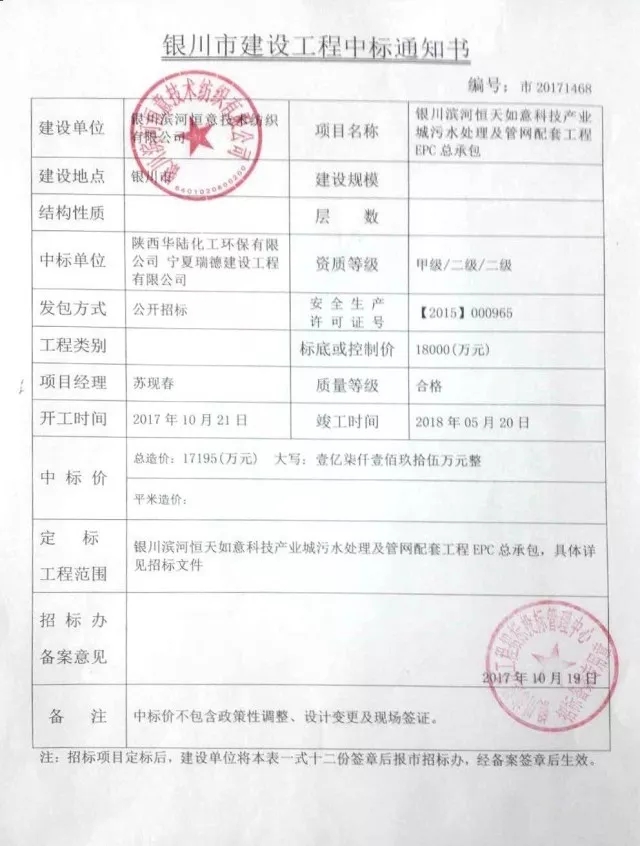 2017年10月19月,華陸環(huán)保憑借著豐富的行業(yè)經(jīng)驗、良好的市場信譽、優(yōu)秀的設(shè)計團隊、完善的服務(wù)體系以及專業(yè)的投標(biāo)方案,成功中標(biāo)銀川濱河恒天如意科技產(chǎn)業(yè)城污水處理及管網(wǎng)配套工程EPC總承包項目(以下簡稱:中標(biāo)項目),中標(biāo)金額為1.7195億元。