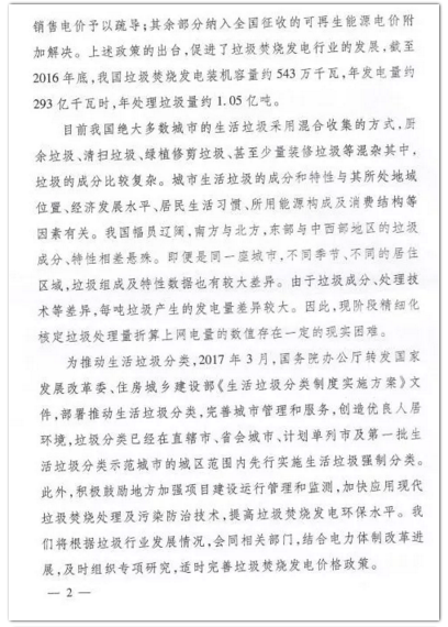 今年年初,環(huán)境商會(huì)以全國工商聯(lián)團(tuán)體提案的形式向兩會(huì)遞交《關(guān)于適度提高垃圾焚燒折算電量的提案》,國家發(fā)改委于9月正式答復(fù)。