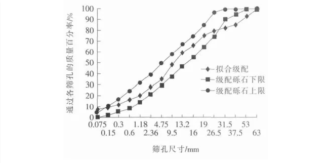 根據振動擊實后建筑垃圾的級配擬合曲線特點,對由相似級配延伸法得到的最大公稱粒徑為75mm、最小公稱粒徑為4.75mm的建筑垃圾級配進行優(yōu)化,即得建筑垃圾用于公路墊層的級配范圍。