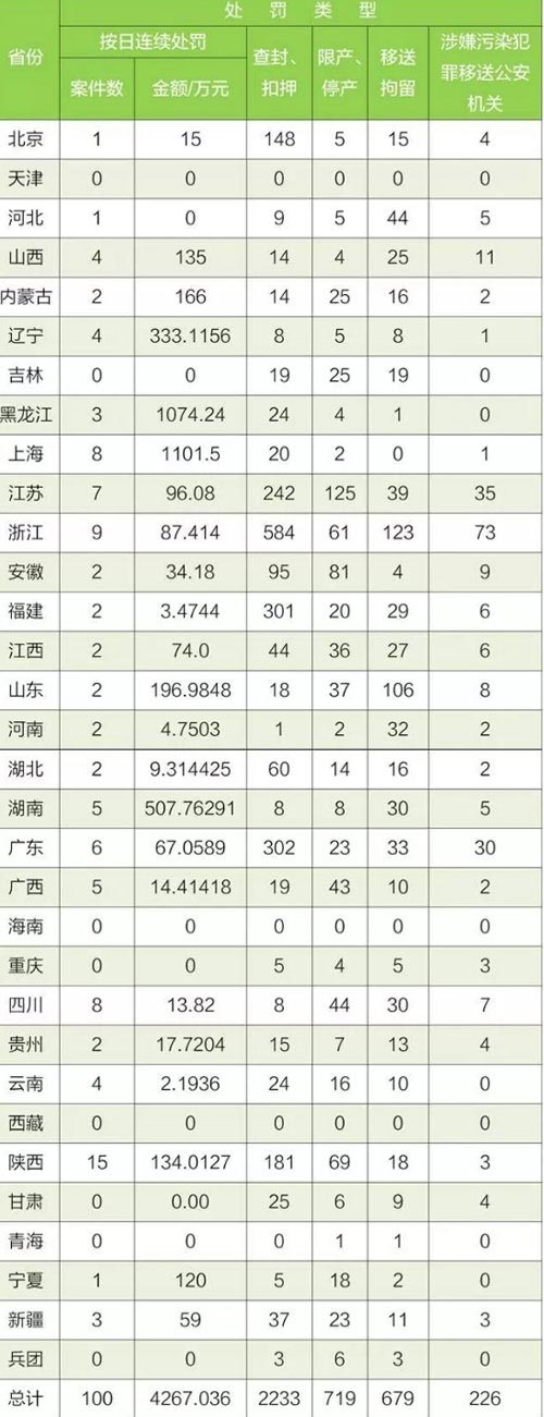 1-9月,全國(guó)實(shí)施五類(lèi)案件總數(shù)28708件。同比去年1-9月增長(zhǎng)146%。其中,按日連續(xù)處罰案件822件,比去年增長(zhǎng)57%。罰款金額達(dá)96057.6萬(wàn)元,比去年增長(zhǎng)73%;查封、扣押案件13115件,比去年增長(zhǎng)156%;限產(chǎn)、停產(chǎn)案件6420件,比去年增長(zhǎng)170%;移送行政拘留6278起,比去年增長(zhǎng)172%;移送涉嫌環(huán)境污染犯罪案件2073件,比去年增長(zhǎng)53%。