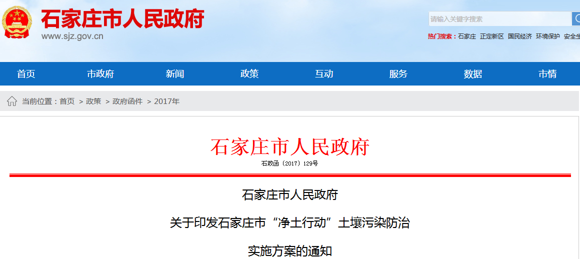 近日,石家莊市政府印發(fā)了《石家莊市“凈土行動”土壤污染防治實施方案》,方案提出到2020年,全市土壤環(huán)境質(zhì)量穩(wěn)中向好,重點區(qū)域土壤污染加重趨勢得到控制,農(nóng)用地土壤環(huán)境得到有效保護,建設(shè)用地土壤環(huán)境安全得到基本保障,全市土壤環(huán)境監(jiān)管能力得到顯著提升,土壤環(huán)境風(fēng)險得到全面管控。到2020年,全市受污染耕地安全利用率達到896%以上;污染地塊安全利用率不低于90%。全文如下: