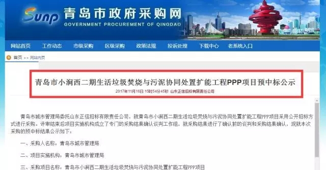 11月16日,據(jù)青島市公共資源交易中心消息,青島市小澗西二期生活垃圾焚燒與污泥協(xié)同處置擴(kuò)能工程PPP項(xiàng)目已公布預(yù)中標(biāo)公示,上??岛悱h(huán)境股份有限公司為預(yù)成交供應(yīng)商。