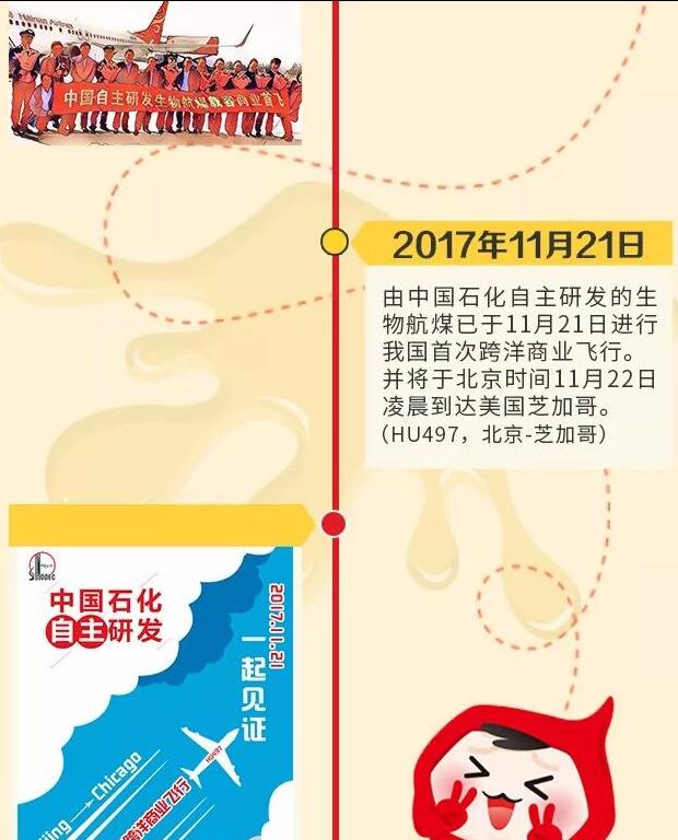 北京時間2017年11月22日02:11,美國中部時間2017年11月21日12:11,加注中國石化1號生物航空煤油的海南航空HU497航班波音787型客機,跨越太平洋,平穩(wěn)降落在美國芝加哥奧黑爾國際機場。這標(biāo)志著中國自主研發(fā)生產(chǎn)的1號生物航煤首次跨洋商業(yè)載客飛行取得圓滿成功。