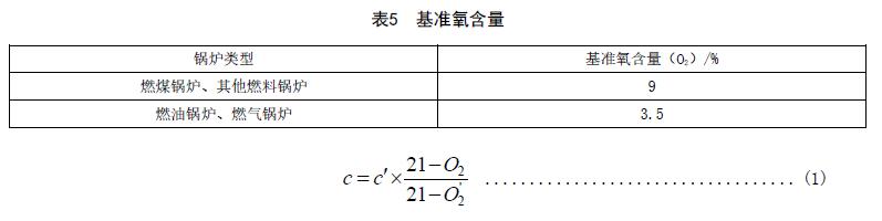 實(shí)測(cè)的鍋爐顆粒物、二氧化硫、氮氧化物、汞及其化合物排放濃度,必須按公式(1)折算為基準(zhǔn)氧含量排放濃度。各類鍋爐的基準(zhǔn)氧含量按表5的規(guī)定執(zhí)行。