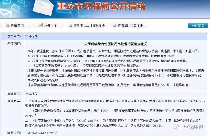 關于來信人咨詢醫(yī)療廢水處理污泥是否屬于危險廢物問題,我局及時與來信人取得了聯(lián)系,就其關心的問題進行了溝通,現(xiàn)將有關辦理情況函復如下: