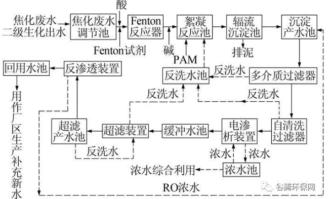 焦化廢水二級(jí)生化出水深度處理系統(tǒng)的外排濃水經(jīng)混合后自流進(jìn)入焦化廢水調(diào)節(jié)池, 調(diào)節(jié)水量及水質(zhì)后經(jīng)泵加壓提升進(jìn)入Fenton 反應(yīng)器,加酸控制Fenton 反應(yīng)器的進(jìn)水pH 并投加Fenton 試劑,其出水進(jìn)入絮凝反應(yīng)池,加堿調(diào)節(jié)使絮凝反應(yīng)池進(jìn)水呈中性, 同時(shí)投加PAM 強(qiáng)化絮凝, 出水進(jìn)入輻流沉淀池,沉淀池出水進(jìn)入沉淀產(chǎn)水池,再次加壓提升后依次通過多介質(zhì)過濾器及自清洗過濾器進(jìn)行預(yù)過濾,出水進(jìn)入電滲析裝置進(jìn)行初次脫鹽,其出水進(jìn)入緩沖水池,電滲析裝置的濃水排入濃水池供內(nèi)循環(huán)利用, 多余濃水排出系統(tǒng)進(jìn)行綜合利用, 緩沖水池的出水經(jīng)泵提升后進(jìn)入超濾裝置,出水進(jìn)入超濾產(chǎn)水池,超濾產(chǎn)水池出水經(jīng)泵提升通過保安過濾器后進(jìn)入反滲透裝置進(jìn)行再次脫鹽,出水進(jìn)入回用水池,作為廠區(qū)生產(chǎn)補(bǔ)充新水使用, 反滲透裝置濃水回流至沉淀產(chǎn)水池進(jìn)行再次循環(huán)脫鹽。