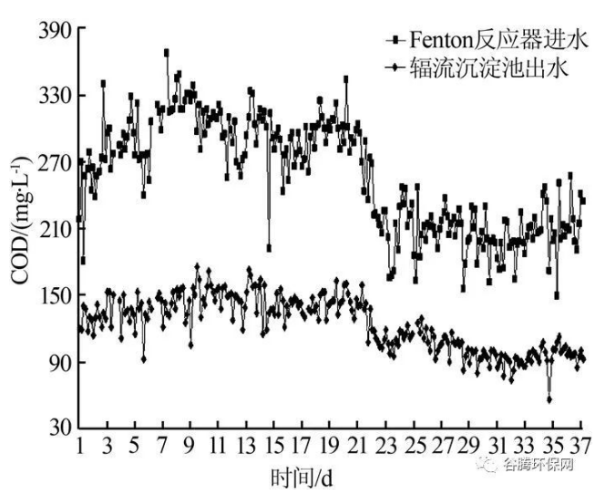 流沉淀池是利用物理吸附、架橋、沉淀作用,通過投加混凝劑或助凝劑實(shí)現(xiàn)對(duì)污染物的強(qiáng)化分離去除。該工程廢水經(jīng)調(diào)節(jié)池(水力停留時(shí)間為8.2 h)進(jìn)行水質(zhì)水量調(diào)節(jié)后, 進(jìn)入Fenton 反應(yīng)器。投加H2SO4調(diào)節(jié)Fenton 反應(yīng)器(HRT=2~3 min)的進(jìn)水pH為2.5~3.0, 控制H2O2與FeSO4的投加量分別為0.7~1.2、2.1~3.1 g/L;絮凝反應(yīng)池的反應(yīng)時(shí)間設(shè)置為0.17 h,PAM投加量為4~6 mg/L, 其進(jìn)水投加NaOH來調(diào)節(jié)廢水pH 至中性; 輻流沉淀池的水力負(fù)荷為0.85 m3/(m2˙h), 沉淀時(shí)間設(shè)置為4.05 h。廢水經(jīng)Fenton 反應(yīng)器、絮凝反應(yīng)池、輻流沉淀池處理后對(duì)COD 的去除效果如圖2所示。