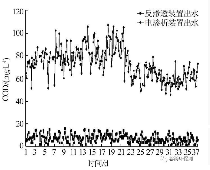 2.3 超濾裝置、反滲透裝置:超濾裝置作為反滲透裝置的預(yù)處理裝置, 為反滲透裝置提供濁度<0.2 NTU、SDI<3 的進(jìn)水,在降低反滲透裝置的化學(xué)清洗頻率、延長(zhǎng)反滲透膜的使用壽命及保障反滲透系統(tǒng)的穩(wěn)定運(yùn)行等方面起到保安作用。反滲透裝置作為二級(jí)脫鹽裝置,可將廢水中剩余的溶解鹽、膠體、有機(jī)物等去除。該工程采用的超濾膜材質(zhì)為聚偏氟乙烯(PVDF)膜,膜數(shù)量為60 支/套、平均運(yùn)行通量為60 L/(m2˙h)、產(chǎn)水量為180 m3/(h˙套),共2 套,超濾產(chǎn)水進(jìn)入超濾產(chǎn)水池(ht為0.67 h)。反滲透裝置前設(shè)置保安過濾器,孔徑為5 μm,共2 臺(tái)。反滲透裝置采用渦卷式反滲透膜,膜數(shù)量為204 支/套、回收率70%、平均運(yùn)行通量為15 L/(m2˙h)、產(chǎn)水量為113 m3/(h˙套),共2 套。廢水經(jīng)超濾裝置、反滲透裝置處理后對(duì)COD、電導(dǎo)率的去除效果如圖5、圖6 所示。
