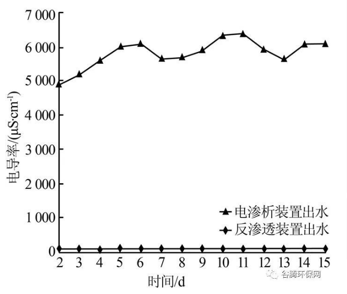 從圖3 可知, 在輻流沉淀池出水COD 平均為107.1 mg/L 條件下,電滲析裝置出水的COD 平均為77.84 mg/L,平均去除率為27.3%,說明多介質(zhì)過濾器、自清洗過濾器對(duì)輻流沉淀池出水COD 去除效果穩(wěn)定,可以保證電滲析裝置正常運(yùn)行。根據(jù)工程實(shí)際運(yùn)行工況,電滲析裝置的清洗周期一般為2 個(gè)月。從圖4 可知,該工藝的調(diào)節(jié)池出水、輻流沉淀池出水、電滲析裝置出水的電導(dǎo)率分別在5 672~6 573、7 090~9 002、2 127~3 600 μS/cm范圍內(nèi)。由于在Fenton 反應(yīng)器進(jìn)水投加硫酸、絮凝反應(yīng)池進(jìn)水投加NaOH,導(dǎo)致輻流沉淀池出水平均電導(dǎo)率較調(diào)節(jié)池出水高31.4%,但經(jīng)過初次脫鹽后,電滲析裝置出水平均電導(dǎo)率較調(diào)節(jié)池出水低53.2%,脫鹽效果顯著,緩解了后續(xù)反滲透膜的脫鹽壓力。