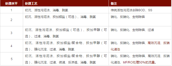 從上表中可以看到,對于TN<10mg/L以內(nèi)的要求只是常規(guī)的硝化反硝化+生物除磷+過濾,可選擇性地投加化學(xué)除磷藥劑和外加碳源,并不包含反硝化濾池。反硝化濾池只用于處理水平4(TN<3mg/L)和處理水平5(TN<2mg/L)的要求。