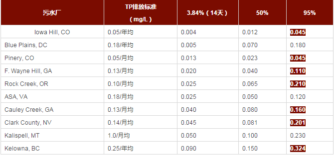 同時,在上述統(tǒng)計分析過程中,TPS-14d與TPS-50%、TPS-95%的比值也是一個有趣的現(xiàn)象,對于TN和TP,TPS-14d約為TPS-50%的40~60%,TPS-95%約為TPS-50%的200~300%,這充分說明即使在美國最好的脫氮除磷污水處理廠(相當(dāng)一部分是達(dá)到極限脫氮除磷標(biāo)準(zhǔn))其出水氮磷水質(zhì)也存在較大的波動性。